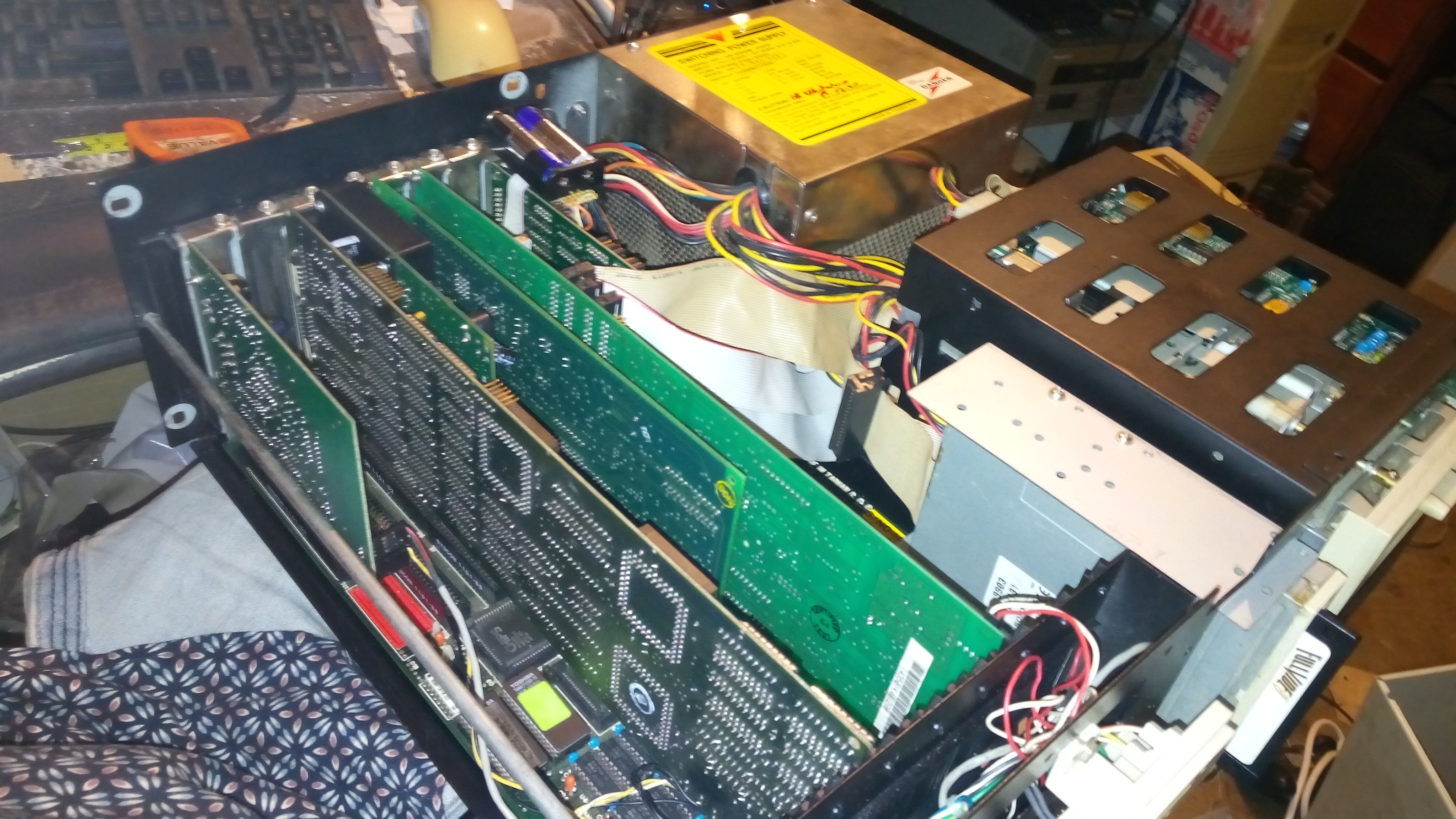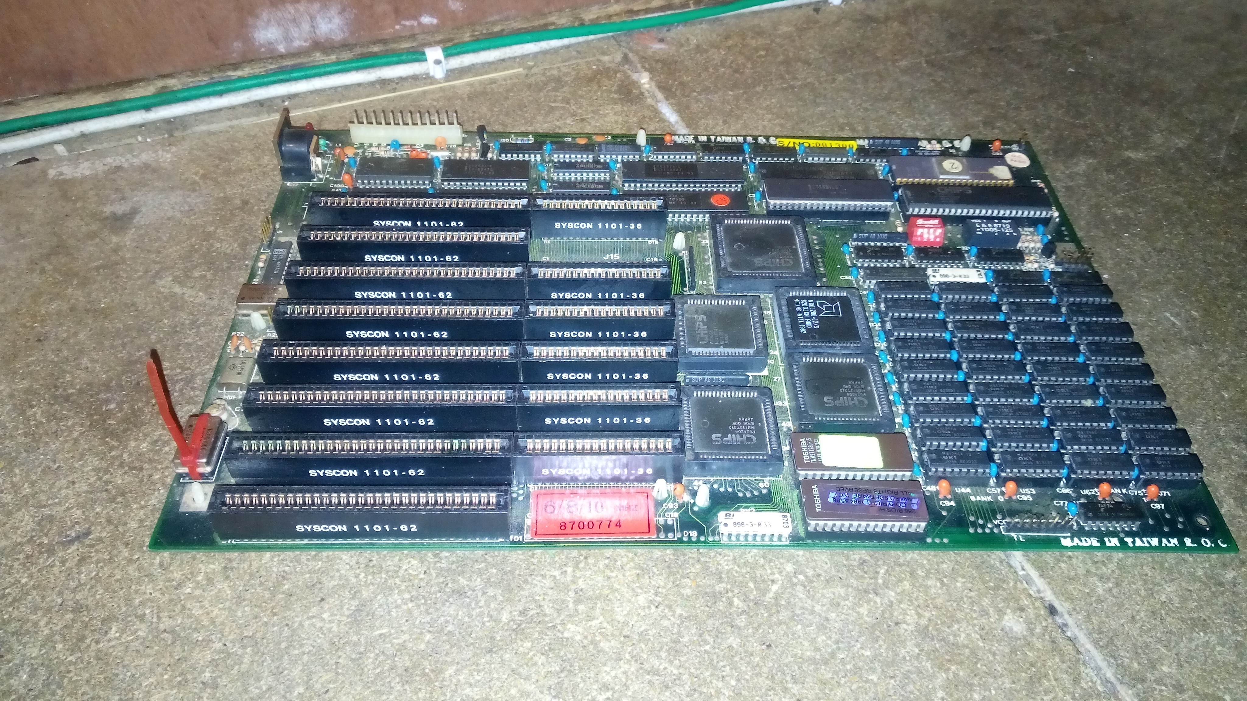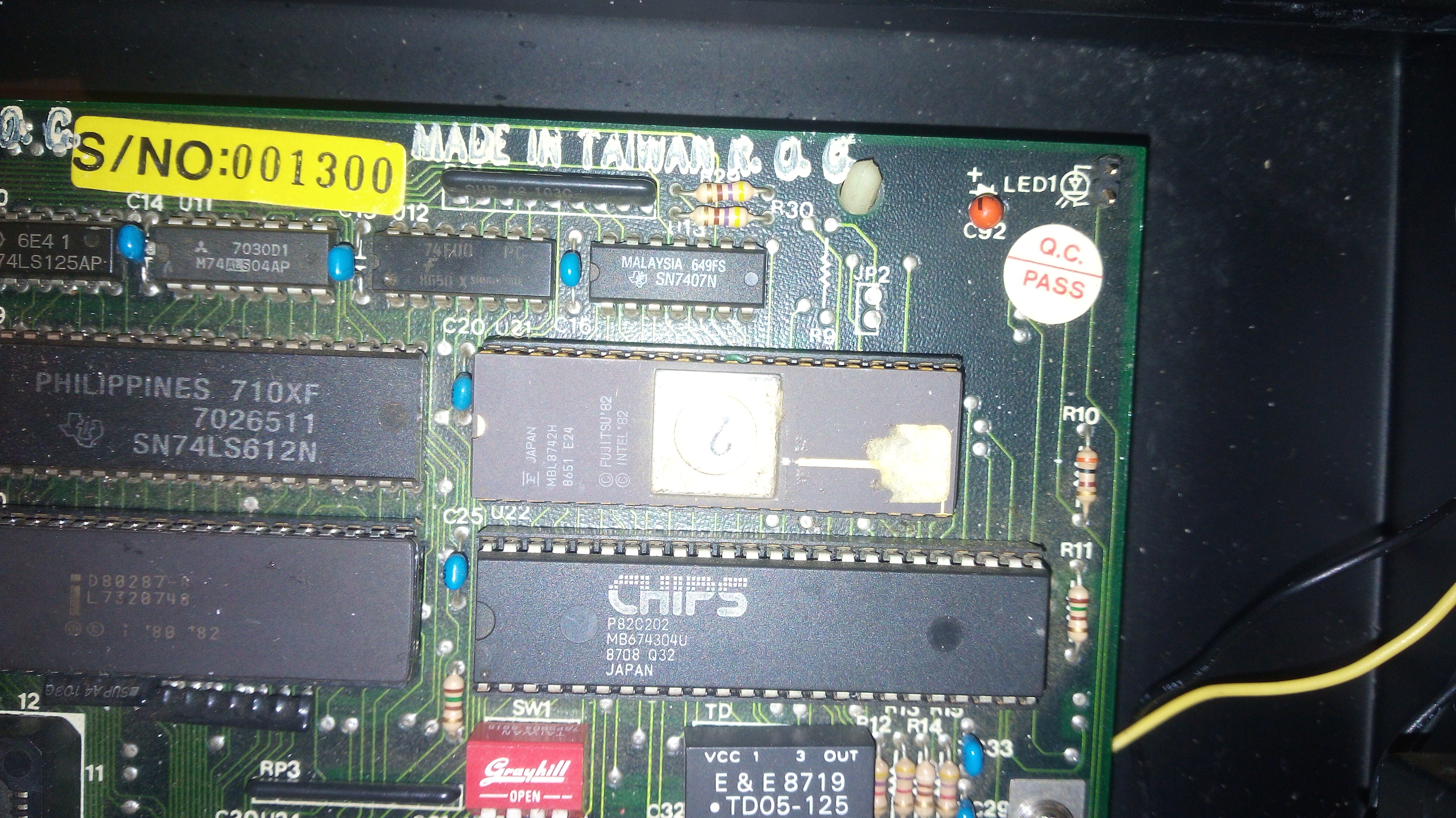Further signs of quality appear in the form of bodge wires inside IC sockets. Also note the old style 'lumpy' solder mask. Overall, they don't quite seem to have gotten the hang of cloning AT class machines just yet, but it's mostly there, albeit a little ugly. All that said, I wouldn't have it any other way and love this thing. |