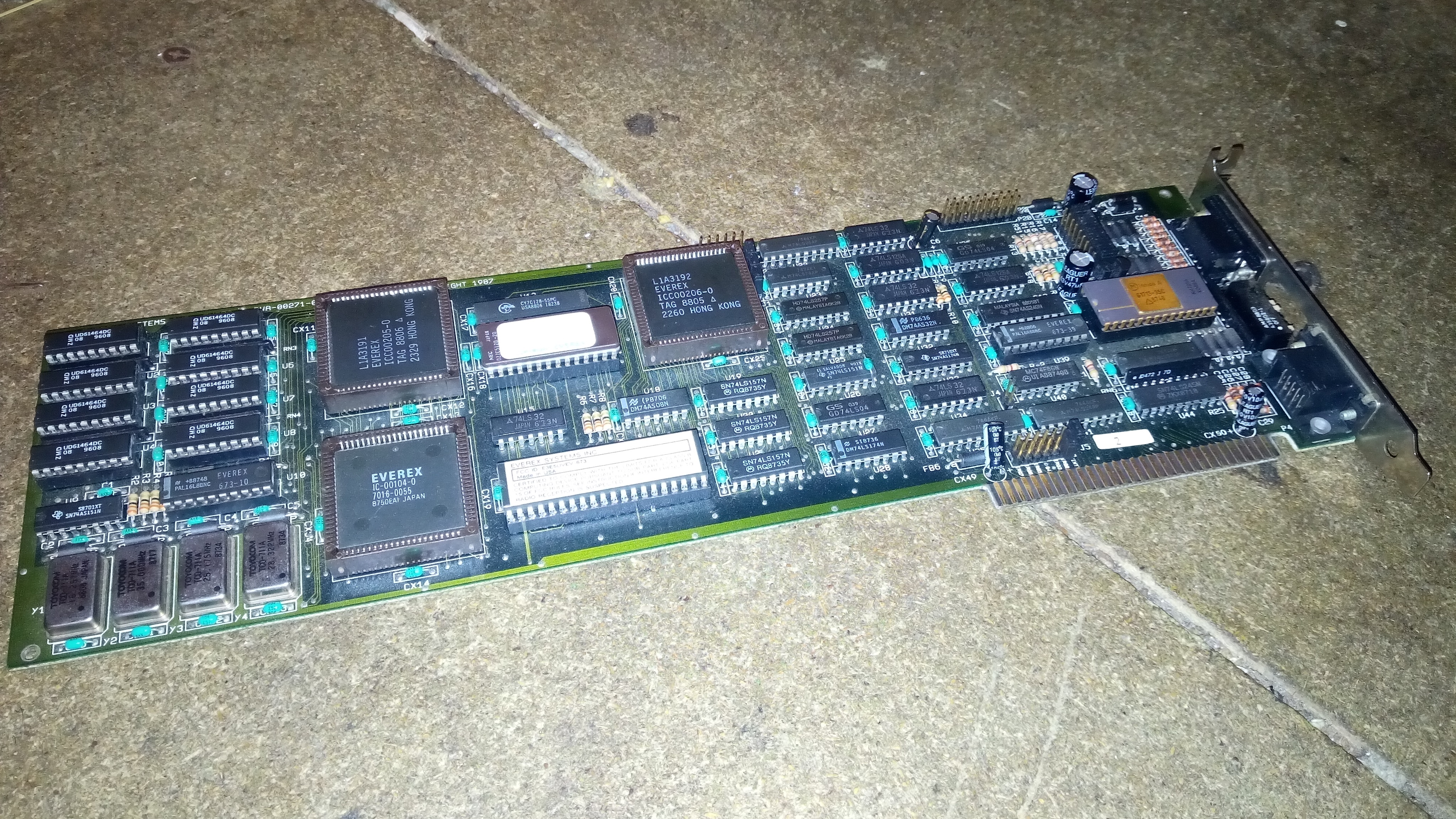 Everex used C&T's first VGA clone from 1987, though the parts on this card are largely unchanged from their EGA clone. This is pure VGA with slight incompatibilities and a mere 256K of DRAM. There are no SVGA modes or anything fancy going on here. Supposedly it can emulate a Hercules on the TTL port at the same time as doing VGA. |