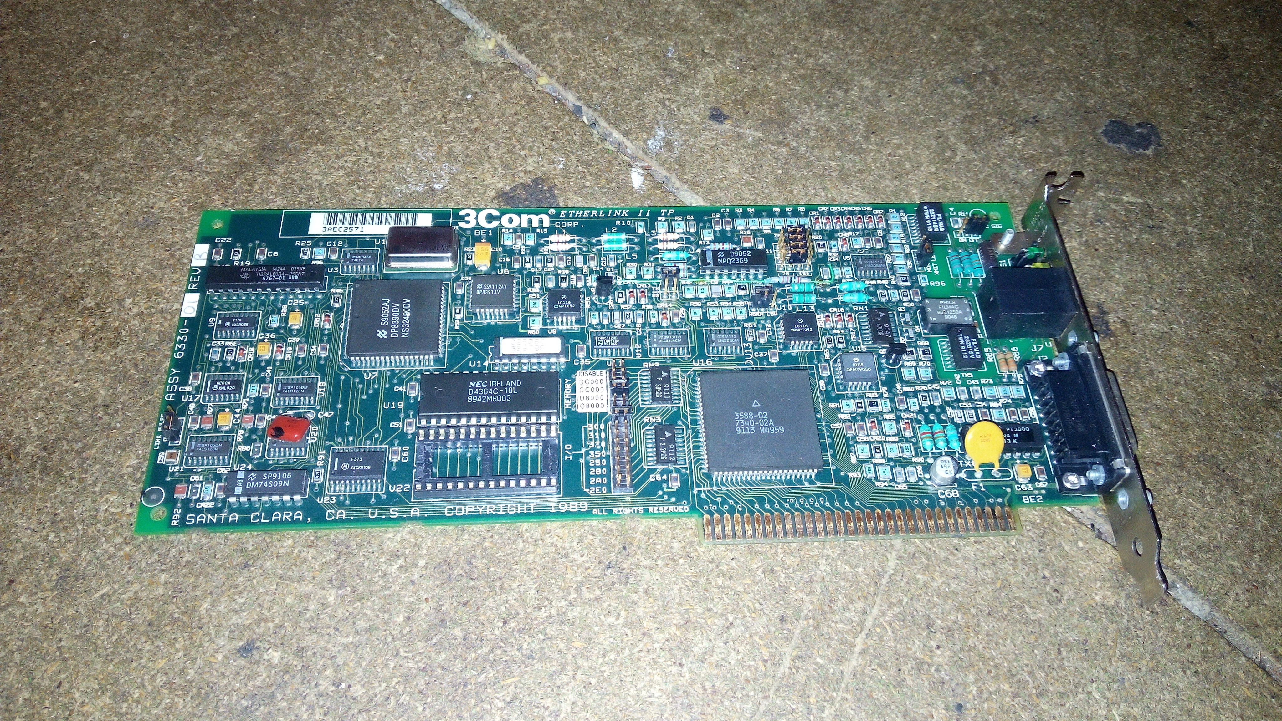 Twisted Pair would have been very costly in this time, but this 3Com EtherLink II TP has it (denoted by the TP). It's a 10BaseT Half-Duplex card, so not speedy, but it's faster than the hard drive, which it could otherwise fill in under a minute. Like everything else in this machine, this thing uses a ton of NMOS and barfs heat. |