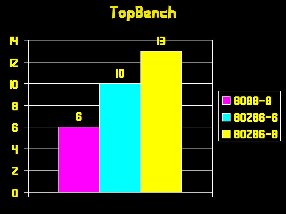 System Performance There really isn't much to say here. The results say it all and the performance gap is really self evident. The 286 would eventually scale to upwards of 20MHz and at that speed, could often even marginally outstrip the later 386. Tawnia even incurs a marginal hit from having the 5MHz 287 in the board, but even still, the poor old 8088 has no chance of catching us. |